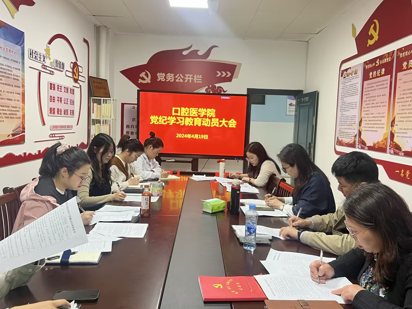 4月19日,sunbet申慱官网召开党总支(扩大)会议,传达学习省委、省卫生健康委以及学校关于党纪学习教育有关会议精神,动员部署开展党纪学习教育工作。学院党总支副书记罗志红主持会议并讲话,学院党总支委员及各教研室主任参会。