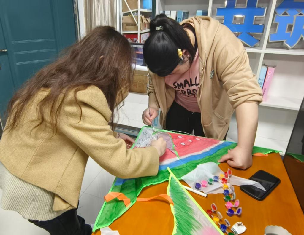 风筝寄托哀思、释放情感和寓意祈福。活动现场同学们自由创作,描绘美丽可爱的图像,释放忧思、舒缓心情。