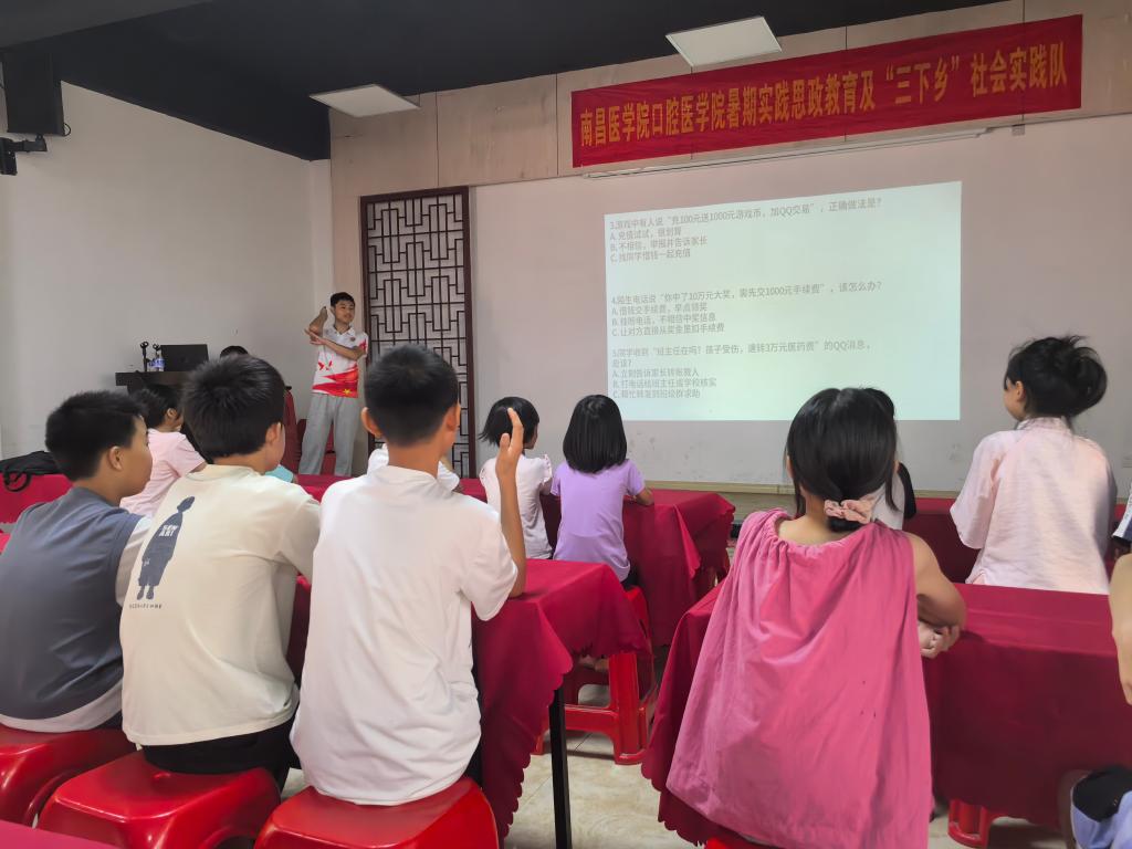 午后,实践队通过互动游戏、实践操作、情景陶冶等多种教学模式为当地孩子们进行授课,全面推进三防教育(防溺水,防火灾,防诈骗)和“口腔保健”宣传教育。有趣的课堂使教学寓教于乐,让孩子们得到了锻炼和成长。