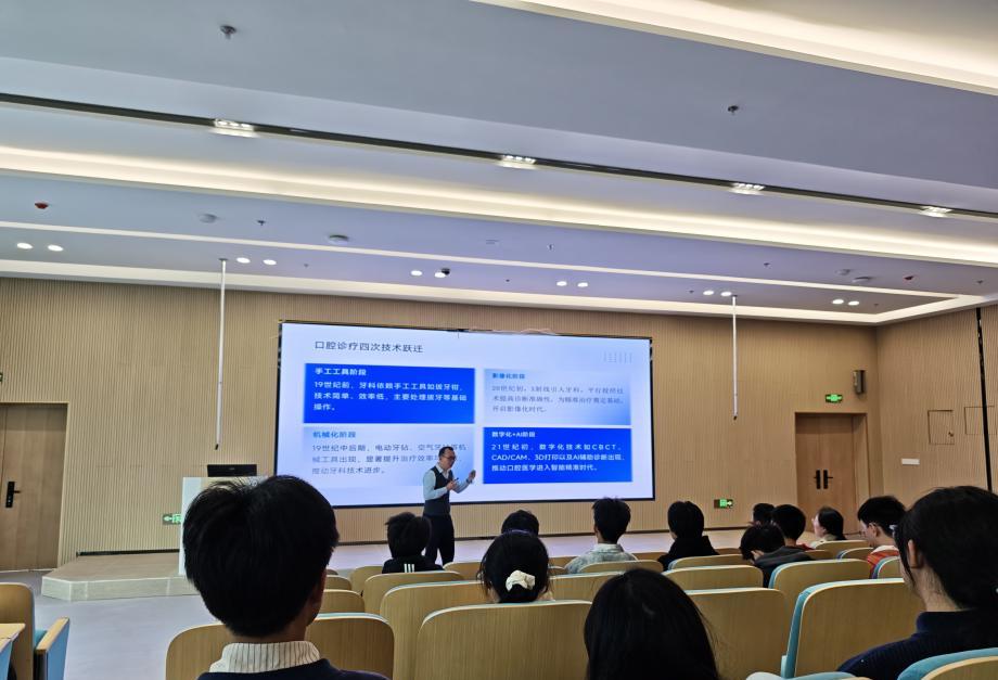 在讲座中,张剑教授以“中西口腔数字化学科建设与未来”为主题展开分享。他系统梳理了口腔医学领域从传统诊疗工具到人工智能技术的演进脉络,清晰呈现了技术迭代带来的行业变革;同时,深入对比了中西方口腔人才培养学制的差异,为在场师生搭建起国际化的学科认知框架,并探讨了在“医技双轨”背景下,从本科到硕博的专业人才培养路径,为专业人才成长提供了清晰指引。