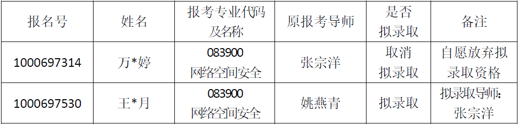 2.原报考张宗洋老师的学术博士研究生经考生本人申请和承诺,自愿放弃拟录取资格,对该指标现依照师生双向选择的原则进行递补拟录取,经学院招生小组审批后同意调整以下2022级博士考生复试结果: