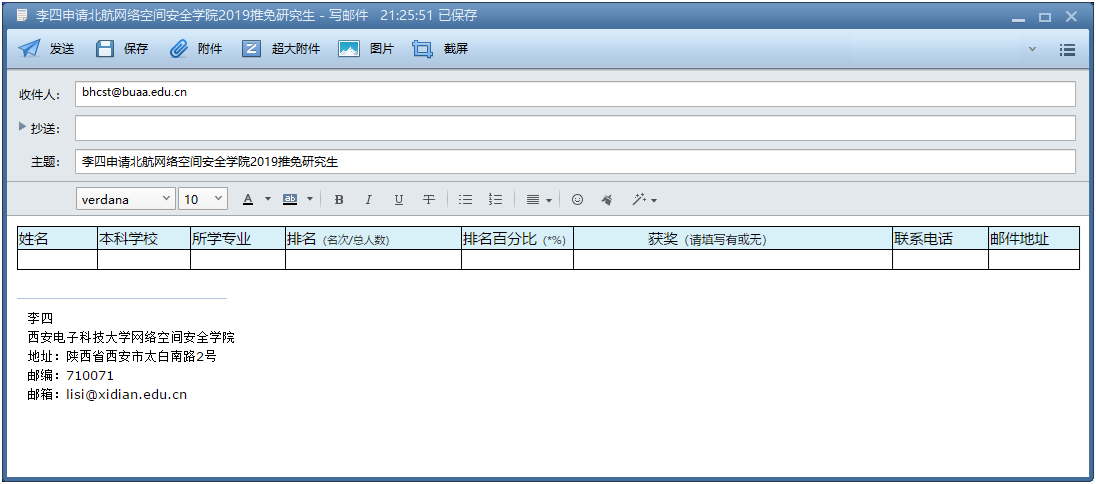 具体办法:4-10项材料制成电子扫描版,与2、3项电子版材料一起压缩,以附件形式发送邮箱:bhcst@buaa.edu.cn;第1项“报名表”填写好后直接“粘贴”到邮件内容页上,邮件主题命名为“×××申请北航必赢242net官网2019推免研究生”。如图: