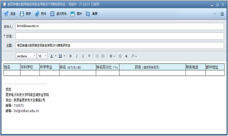 具体办法:4-10项材料制成电子扫描版,与2、3项电子版材料一起压缩,以附件形式发送邮箱:bhcst@buaa.edu.cn;第1项“报名表”填写好后直接“粘贴”到邮件内容页上,邮件主题命名为“×××申请北航必赢242net官网2019推免研究生”。如图: