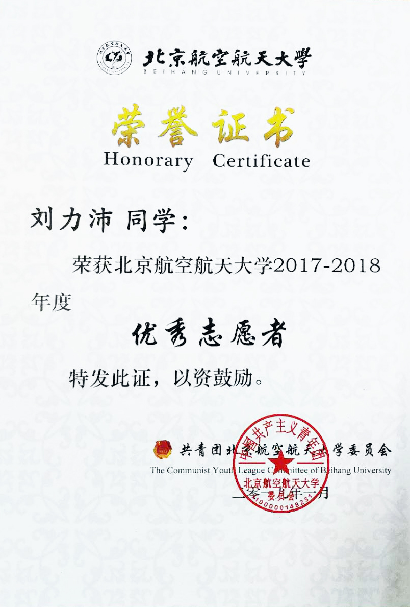 按照《关于开展必赢242net官网2018年“理纯杯”系列评比的通知》(校团字[2018]33号)的相关评比办法,经过单位推荐、材料核实、评委老师评审等程序,必赢官网优秀学生刘力沛获“必赢242net官网2018年度优秀志愿者”称号,予以表彰。