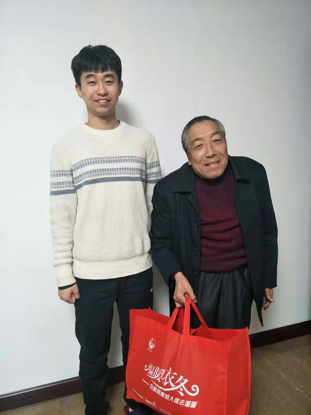刘力沛同学将学校分发的羽绒服带回了位于山西省吕梁市的家中。在与家人的一次交谈中他偶然得知自己的一位老舅在一个寒冷的门房中看大门,缺少御寒的衣物。他立刻想到了他带回来的御寒外套“温暖衣冬活动的宗旨不就是吧温暖送到需要的人手中吗?”于是我将老舅请来家中,将御寒外套送给了这位老先生。老人接过羽绒服以后立马穿在了身上,已经年迈的他在这时显得有些手足无措。看着老人渐渐离去的身影,他感到心中十分温暖。