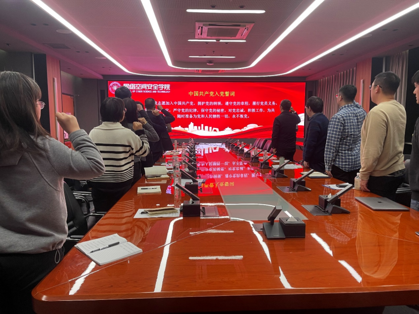 最后,全体与会党员在刘树春副校长的带领下,在党旗下重温入党誓词。大家纷纷表示,本次活动提升了理论水平和思想站位,增强了使命感、责任感,今后要继续积极投身科技强国、网络强国建设,努力攻克一批网络空间安全领域“卡脖子”的关键核心技术,为维护国家安全贡献智慧和力量。