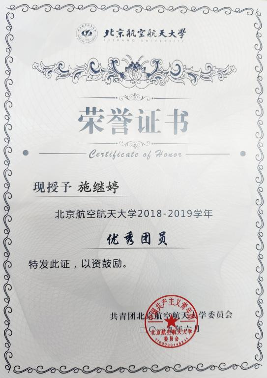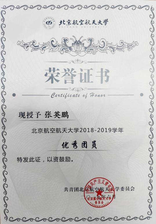 为加强我校共青团的基层组织建设,推动团支部职能化建设,围绕立德树人根本任务,激励基层团支部学习贯彻习近平新时代中国特色社会主义思想,以“四进”为手段,以“四信”为目标,切实学习和践行社会主义核心价值观,弘扬北航“四爱精神”,深入开展“青春心向党·建功新时代”教育实践,创先争优,激励和引导广大团员大力弘扬爱国主义精神,推动各级团组织工作水平的提高。校团委在全校开展2018—2019学年度校 “优秀团员”评选活动,必赢官网优秀学生张英鹏、施继婷获2018—2019学年度校“优秀团员”,予以表彰。